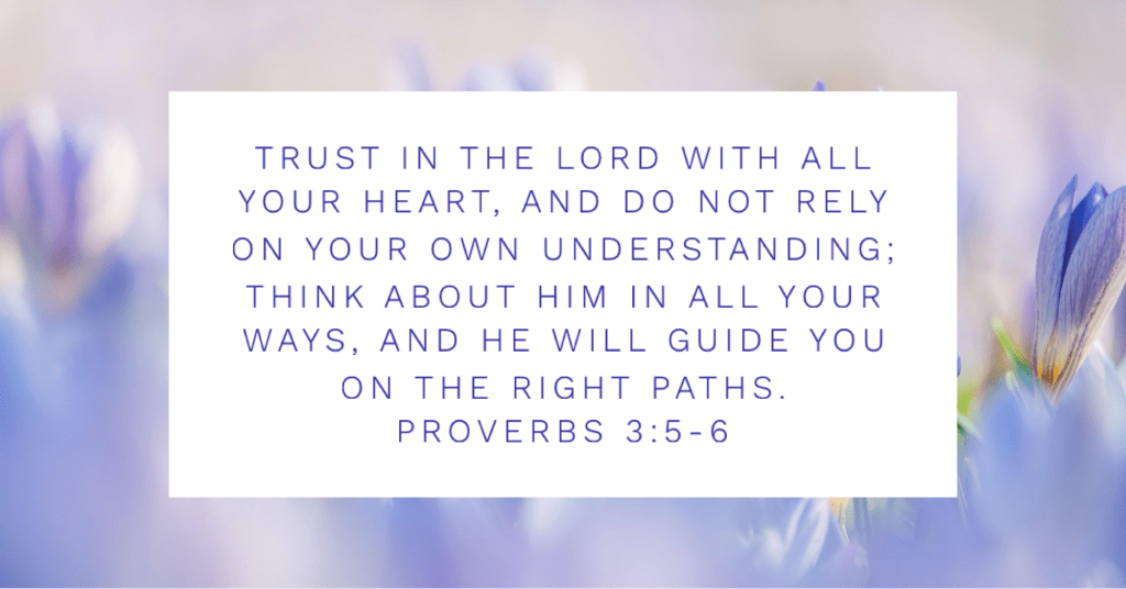I tried really hard to choose a verse that isn’t so well known, but God just kept bringing me back to verses 5 & 6 which say, “Trust in the Lord with all your heart, and do not rely on your own understanding; think about Him in all your ways, and He will guide you on the right paths.” These verses have encouraged me many times over the years.
